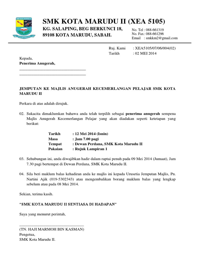 Contoh Surat Rasmi Majlis Anugerah Pelajar Pdf